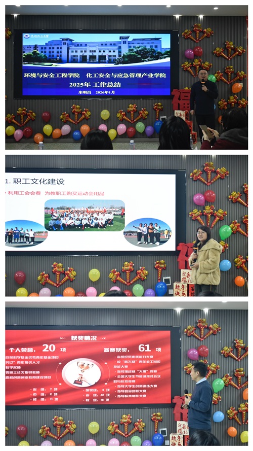 近日,环境与安全工程学院举行“骏马踏春启新程 聚力育人谱华章”总结表彰大会暨2026年新年茶话会。图书馆馆长张万忠,创新创业学院院长张学军,质量建设与绩效考核办公室主任赵慧,党委人才办副主任赵焕新,学院领导班子成员及全体教师参加活动,共同总结过往成就、致敬奋斗身影、共赴发展新程。