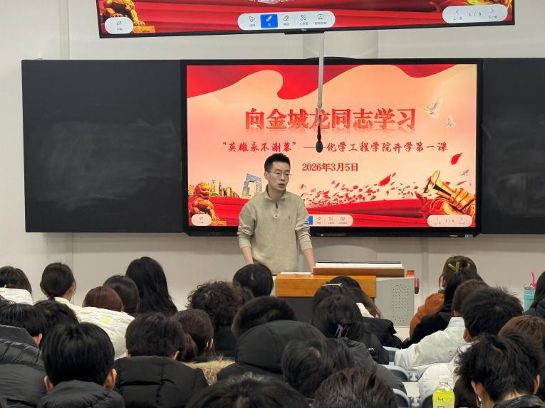 3月5日,化学工程学院召开“向金城龙同志学习”暨英雄永不落幕——开学第一课主题年级大会,共同聆听英雄事迹,感悟榜样力量。会议由辅导员马俊佼主持。