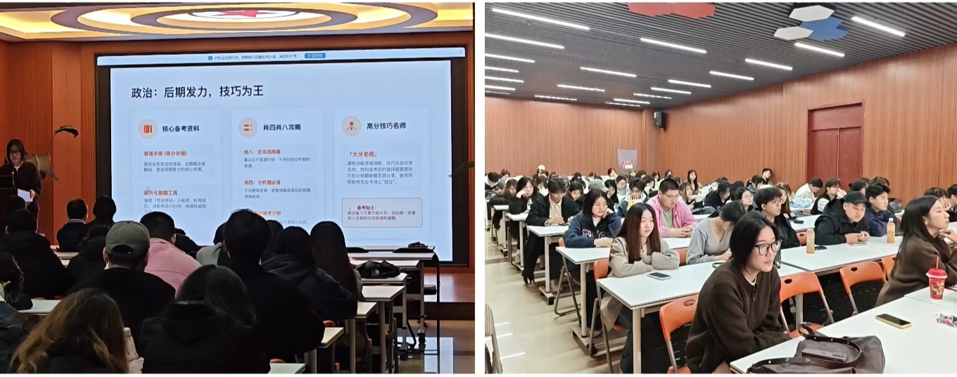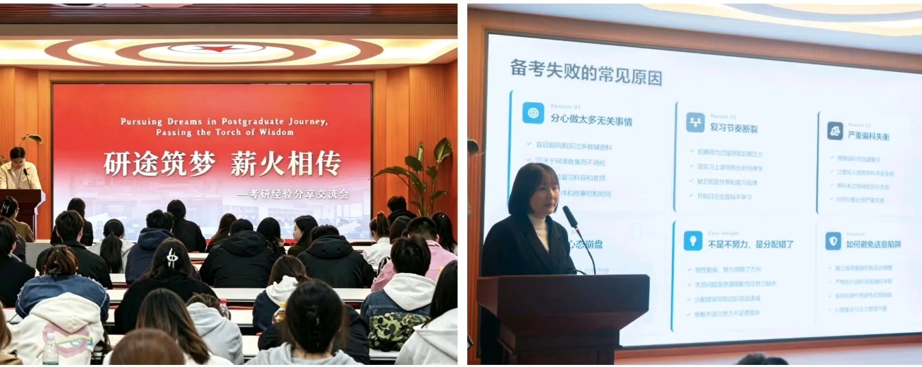 本次分享会内容充实、干货满满,针对性与实用性兼具。考研经验分享环节,三位成功上岸的优秀学子倾囊相授,唐莹莹以智能科技与产品创新为切入点,紧扣“初试优先、复试准备”的核心思路,细致拆解考研全流程备考规划,详细讲解各科高效复习策略;朱飞结合报考专业的特色,分享专属学习方法、时间管理技巧与备考心态调整心得;贾芮分享艺术类学科的理论课学习方法,耐心回应同学们的各类疑问。三位同学的分享为不同专业学子理清了备考思路。