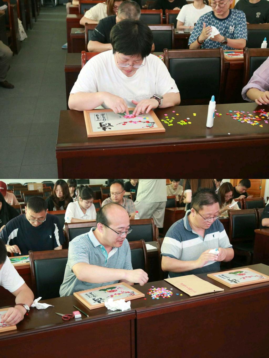 活动伊始,诸位领导与教师、学生党员有序落座,将不同颜色的扣子仔细粘贴于纸板上,描绘出莲花、寒梅等形状,通过“廉洁扣”板绘的艺术形式将廉洁的理念生动形象的展现出来。在构思和粘贴“廉洁扣”的过程中,领导与教师、学生党员聚精会神、全神贯注,全身心投入作品的制作当中,深入思考廉洁的内涵,强化了自身廉洁意识。
