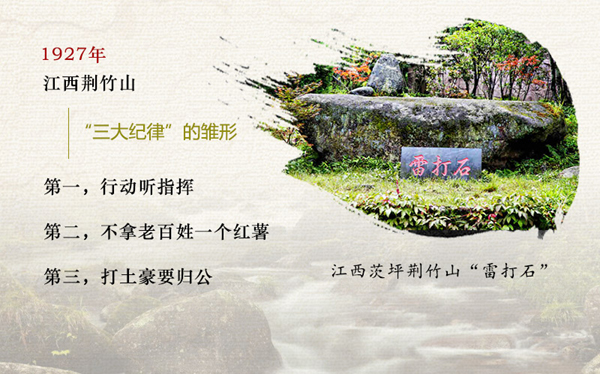 偷吃一个红薯事小,损害群众利益事大。于是在部队出发前,毛泽东在江西茨坪荆竹山“雷打石”前向部队讲话,要求大家一定要和山上的群众搞好关系,还郑重宣布了三大纪律:第一,行动听指挥;第二,不拿老百姓一个红薯;第三,打土豪要归公,这也成为中国工农红军“三大纪律”的雏形。从建军之初,“纪律”就是一个始终不离左右的关键词。