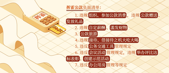 1.违规组织、参加公款消费,违规公款赠送、发放礼品。《条例》第一百一十三条规定,违反有关规定组织、参加用公款支付的宴请、娱乐、健身活动,或者用公款购买赠送或者发放礼品、消费卡(券)等,对直接责任者和领导责任者,情节较轻的,给予警告或者严重警告处分;情节较重的,给予撤销党内职务或者留党察看处分;情节严重的,给予开除党籍处分。