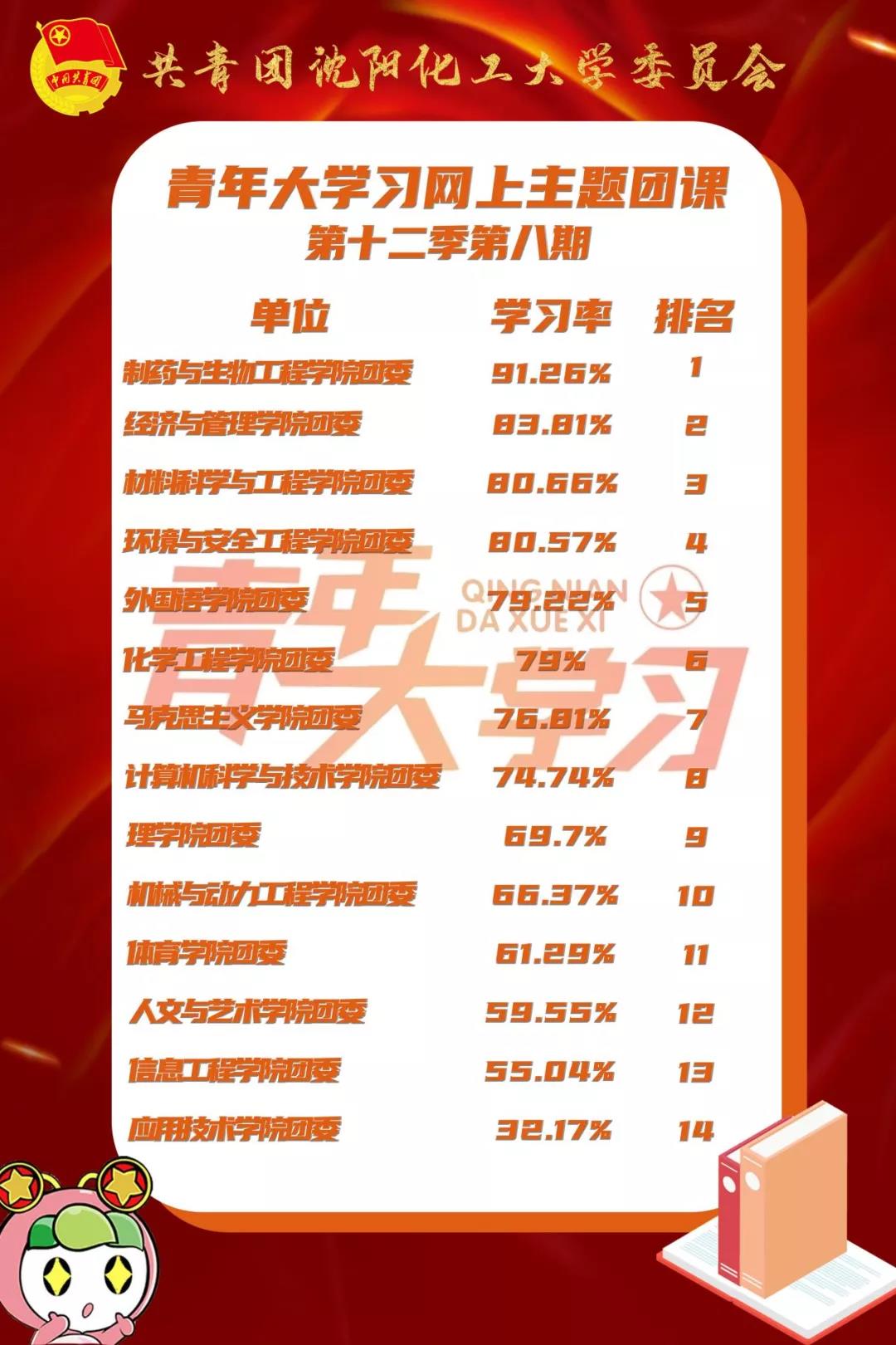 在上一期青年大学习网上主题团课中,制药与生物工程学院团委、经济与管理学院团委、材料科学与工程学院团委的学习率位列前三甲,其中制药与生物工程学院团委的学习率高达91.26%。