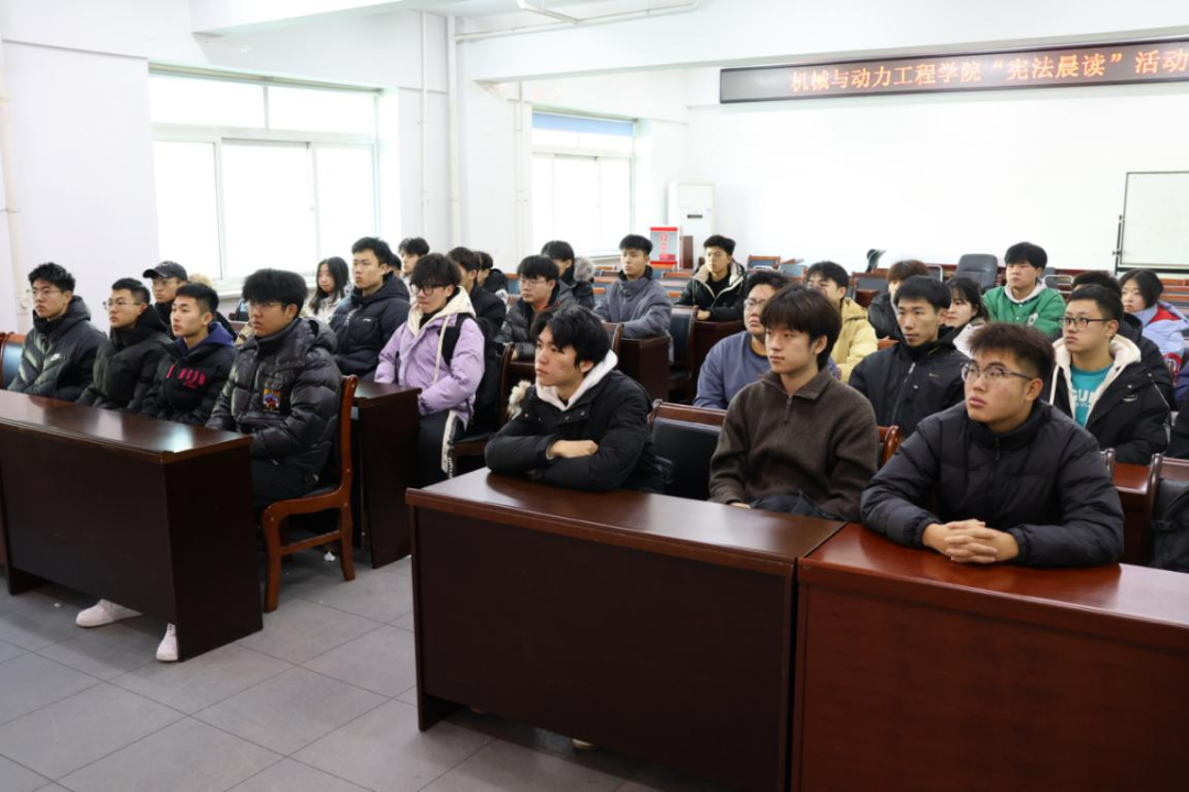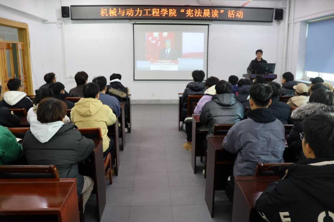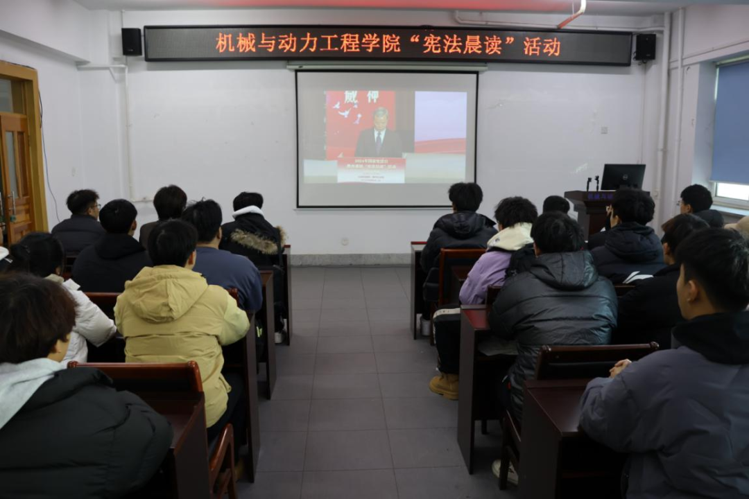 弘扬宪法精神,沈化机动学子在行动。12月4日是国家宪法日,为了增强学生的宪法意识,弘扬宪法精神,推进学院的法治建设,机械与动力工程学院积极响应号召,于致本楼A座308教室,组织开展了此次宪法晨读活动。希望通过观看宪法视频,让机动学子们更加深入地了解宪法的重要性,树立宪法权威,引导师生自觉遵守宪法、维护宪法尊严。本次活动由学院主席团成员胡乙全程主持,为活动的顺利推进注入了强劲动力,引领全院师生沉浸式投入宪法学习热潮。