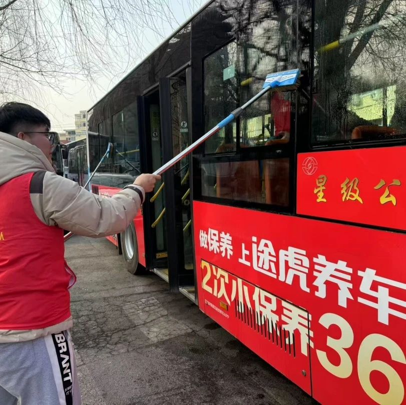 青年突击队队员们着重对公交车的窗户进行清洁工作。在整个活动过程中,志愿者们热情高涨,积极协作,展现了当代大学生良好的精神风貌和强烈的社会责任感。