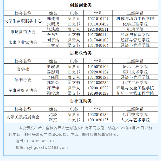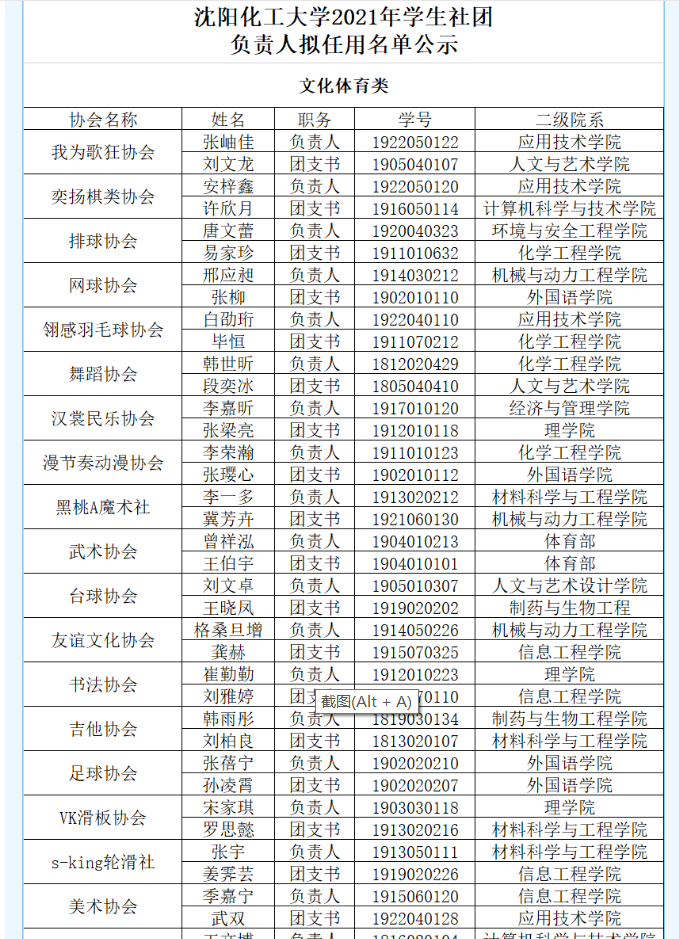 经自主申报、资格审查、组织考察等程序,现公布BB贝博艾弗森官方网站2021年学生社团负责人拟任用名单公示如下: