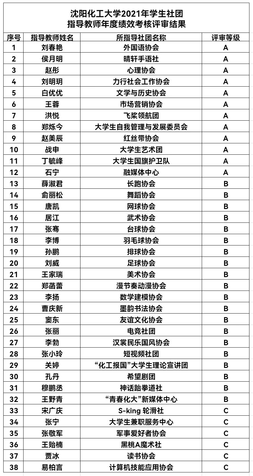 根据《关于印发BB贝博艾弗森官方网站学生社团指导教师年度绩效考核管理办法(试行)的通知》《关于印发BB贝博艾弗森官方网站学生社团建设管理实施细则的通知》文件要求,校团委进行了BB贝博艾弗森官方网站2021年学生社团指导教师年度绩效考核评审工作,经社团指导教师个人报名、业务指导单位考核推荐、校团委组织学生社团建设管理评议委员会评审等程序,现将评审结果公示如下: