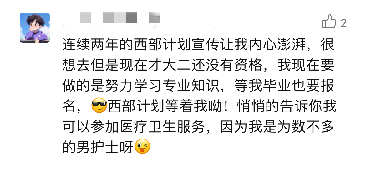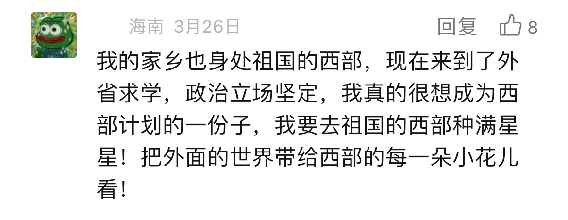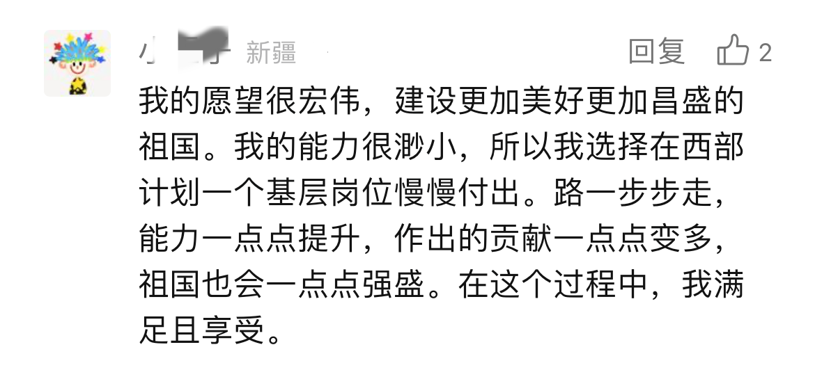 打开留言区,这群年轻人澎湃滚烫的“热情怀”溢出屏幕。“读书16年,我想是时候去做一件这样的事了。”“在党和国家的帮助下我才实现了大学梦,我也想以实际行动回报党和国家”“我的家乡就在西部,想把大山外的世界带给大山里的每一朵小花儿,给祖国的西部种满星星”……“家国所系,我之所行”。我们不难发现,这些字里行间流露出的强烈爱国情感和社会责任感,正是这群年轻人毅然决然报名西部计划的强大“源动力”。