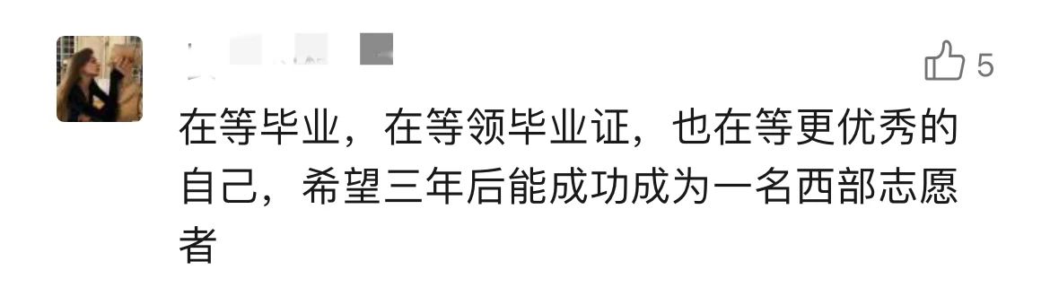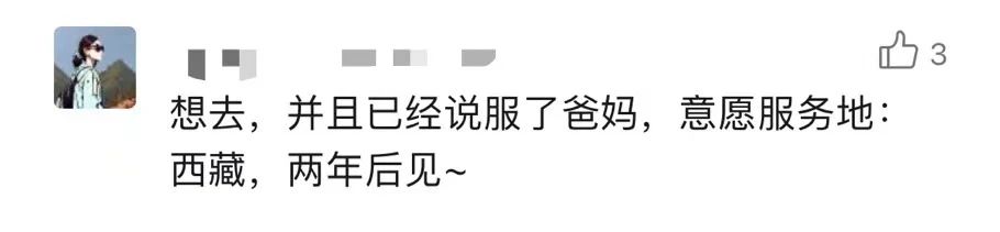 我们感动于一条条发自肺腑的留言,也欣慰于他们义无反顾的选择,更令人动容的是背后那份蓄势已久的“真行动”。“不论是四年前还是四年后,到西部去的想法不仅没变,且越来越清晰。在大学里,我积极参加志愿服务,保持综测和专业学习成绩,到基层组织学习,并光荣成为一名中共党员。付出的努力都让我更有信心和大家一起奔赴西部!”“想去,并且已经说服了爸妈,意愿服务地——西藏,两年后见”“在等毕业,也在等更优秀的自己,希望三年后能成功,西部等我”......西部计划招募对象主要为高校应届毕业生,但不少低年级的大学生朋友们早早动手,主动了解、提前谋划、持续提升,在全力以赴追逐目标的过程中,逐渐练就更加适应西部发展所需、更好在基层“乘风破浪”的“十八般武艺”,增添了更多“我能”“我行”的信心和底气,努力成长为合格的西部计划“后备军”。在离那片孕育理想的西部热土越来越近的同时,也在一步一个脚印遇见更好的自己。