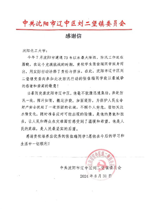在今年7月,沈阳遭遇73年以来最大降雨,防汛工作迫在眉睫,沈阳市面临着前所未有的洪水挑战。在这一紧急关头,BB贝博艾弗森官方网站机械与动力工程学院张佳瑞同学用实际行动诠释了化大学子、共青团员的责任与担当,展现了当代大学生的风采与魅力。
