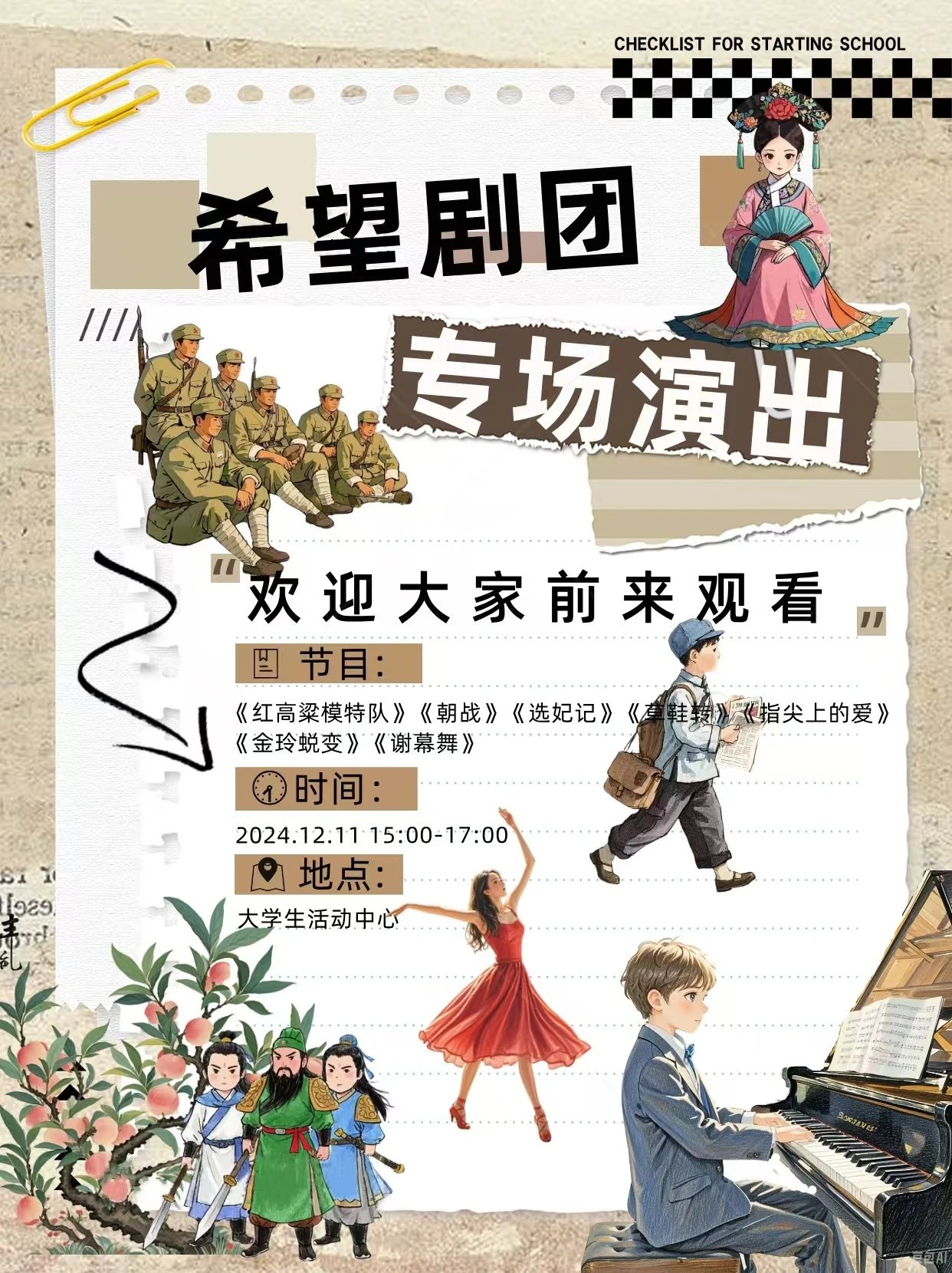 一、活动时间:2024年12月11日15:00。二、活动地点:大学生活动中心礼堂。