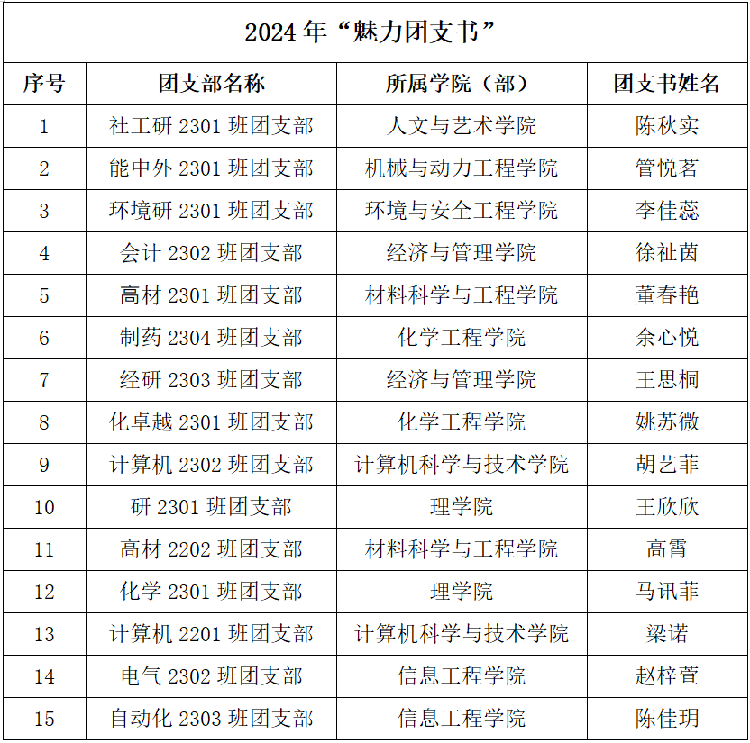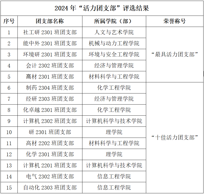 为贯彻落实《共青团中央改革方案》有关精神, 深入实施贝博官网基层团支部“活力提升”工程,校团委于1月3日在团委105会议室开展了2024学年BB贝博艾弗森官方网站“活力团支部”评选工作。经支部申请、学院推荐、学校评议,评选出社工研2301班团支部等15个团支部为2024学年BB贝博艾弗森官方网站“活力团支部”,其中社工研2301班团支部等5个团支部为2024学年BB贝博艾弗森官方网站“最具活力团支部”、制药2304班团支部等10个团支部为2024学年BB贝博艾弗森官方网站“十佳活力团支部”,陈秋实等15位团支书获评2024学年BB贝博艾弗森官方网站“魅力团支书”,评选结果如下: