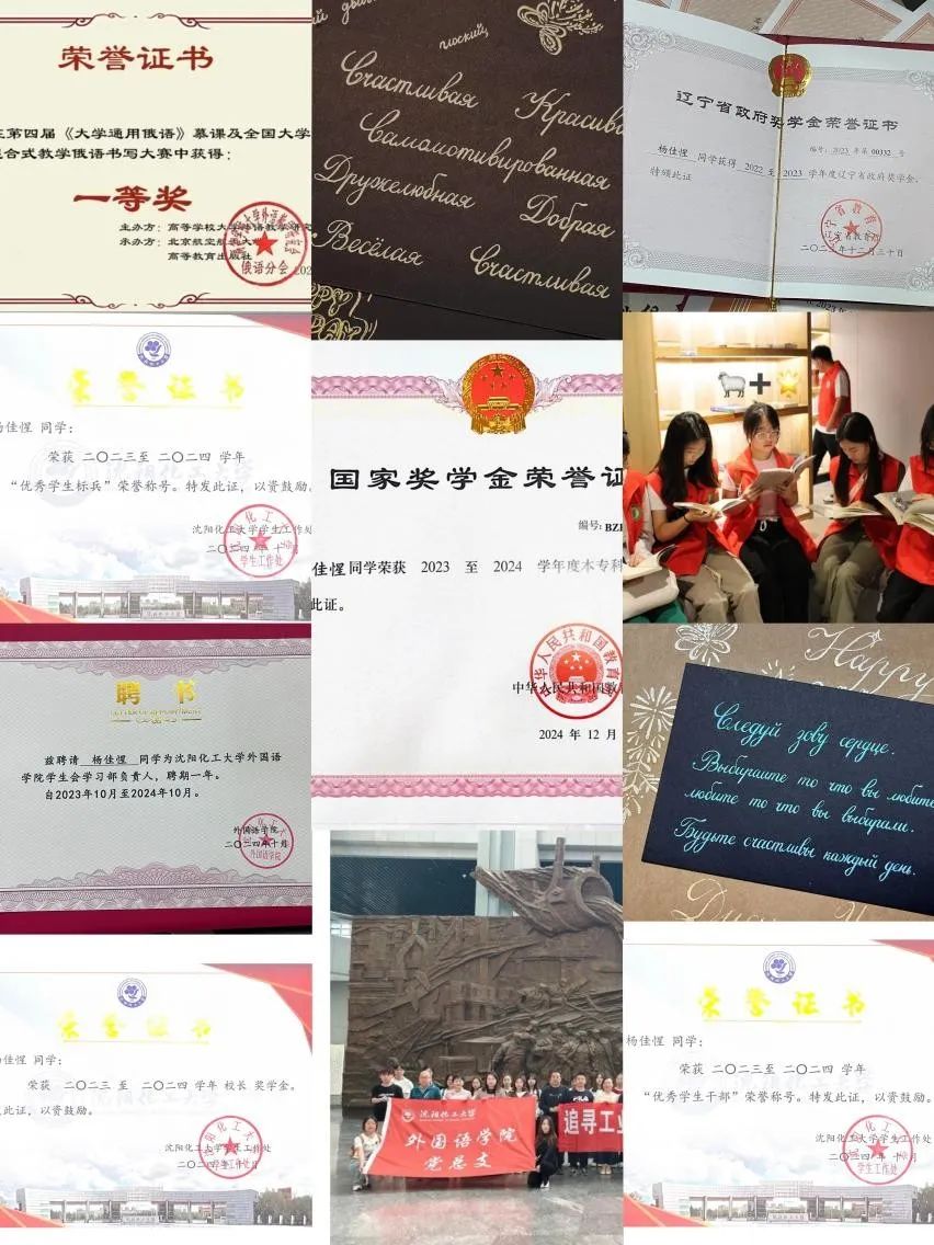 自入校起,她便将校训“强学力行,喻理求真”内化于心,外化于行,以佳绩铸就梦想。她专注课堂、积极互动,23—24学年以绩点4.57、综测91.33稳居学院第一,本学期绩点达4.68,获国家奖学金等多项荣誉。语言学习上,她顺利通过英语四六级及公共俄语四级。作为俄语零基础学习者,她直面语法难点,自学俄语花体书法,获第四届全国大学俄语书写大赛一等奖。从迷茫困惑到技艺精进,其执着让俄语书法绽放异彩。她坚持学用结合,以竞赛锤炼能力。获第九届CFCC智慧经济竞赛二等奖、辽宁省大数据分析竞赛二等奖、“正大杯”市场调查大赛省三等奖等奖项。这些经历不仅充分锻炼了她在学术创新和专业实践方面的能力,也为她的佳绩筑梦之路打下了坚实基础。未来路长,杨佳惺将带着感激与信念,以佳绩铸就梦想,成就惺惺相惜的奋进之路。