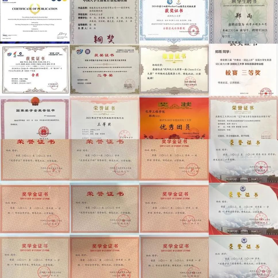 在大学学习中,郑雨始终努力学习专业知识、成绩大三学年绩点4.85、学院排名第一。在校期间累计获得奖项30余项,其国家级奖项2项、省市级奖项4项、其奖学金累计获得11次(1次国家奖学金、1次校长奖学金、1次二等综合奖学金、5次一等综合奖学金、3次百佳千优单项奖学金)。在校期间专业基础课程21门满绩点,42门课程90+。能取得这些成绩离不开明确的学习计划和合理的学习安排。这些专业基础课程打下坚实基础,在班级起到带头模范的作用,积极参加学科竞赛和创新创业竞赛,获2024年中国国际大学生创新大赛(互联网+)国家级铜奖、2023年辽宁省大学生数学建模省级三等奖、2024年辽宁省大学生创新创业训练计划中立项省级项目,同时并参与发表学术论文一篇,国家发明专利一项。