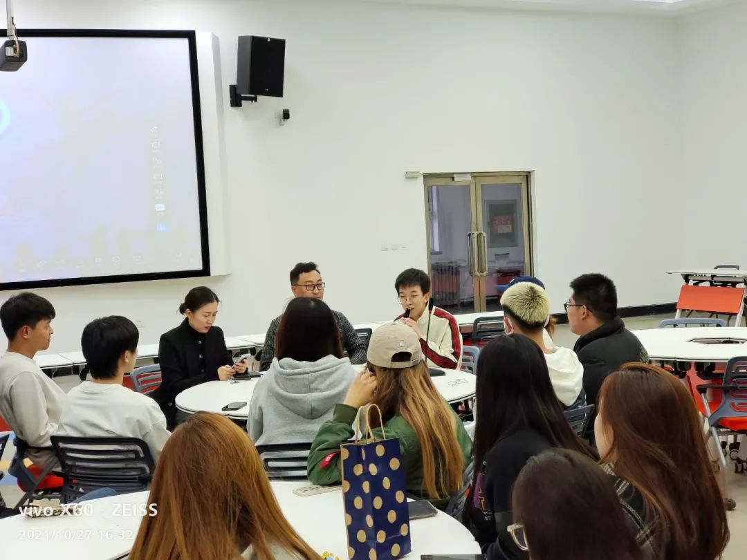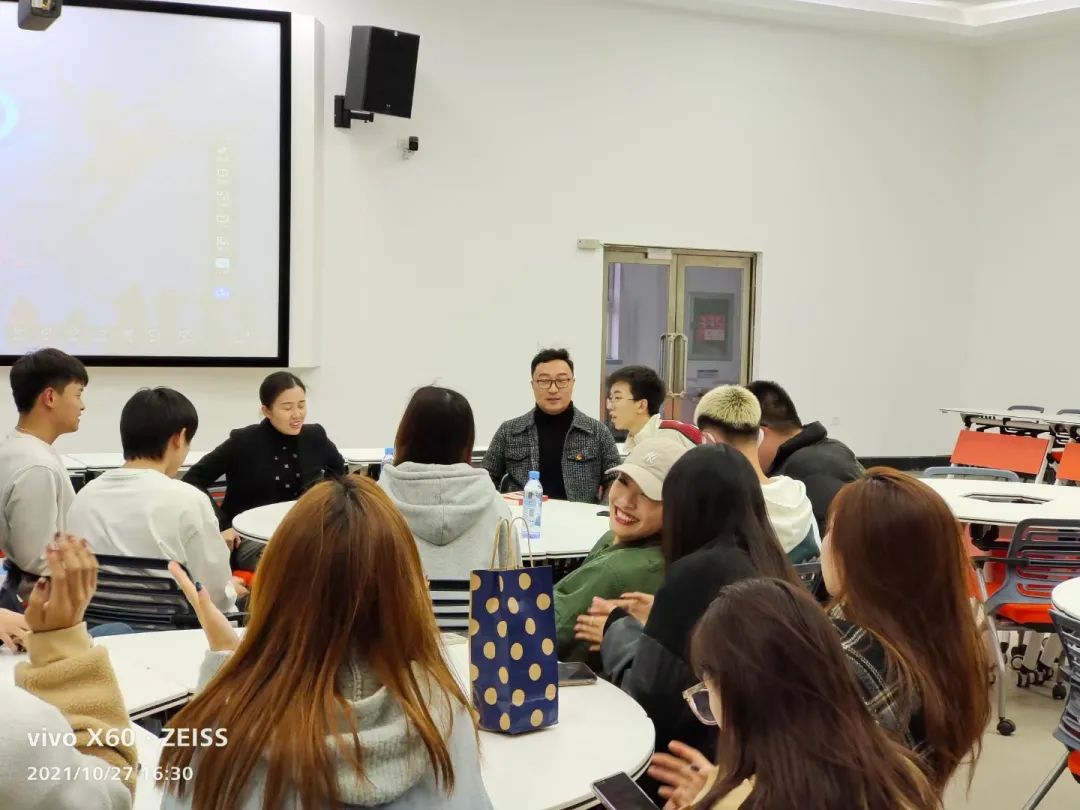 校团委书记战申、艺术团指导教师孔丹与大学生艺术团团员围坐在圆桌前进行了亲切的座谈。