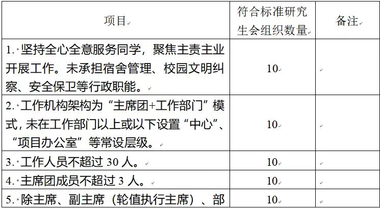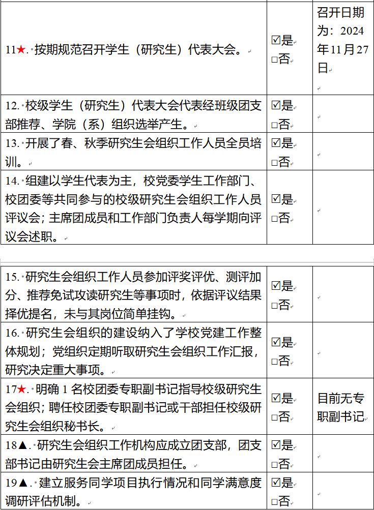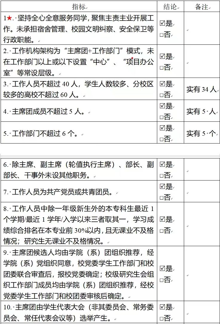 为落实共青团中央、教育部、全国学联联合下发的《关于推动高校学生会(研究生会)深化改革的若干意见》,并结合《关于巩固高校学生会(研究生会)改革成果的若干措施》文件要求,接受广大师生监督,现将贝博官网2024—2025学年研究生会改革情况公开如下。一、改革自评表(一)校级研究生会组织改革自评表标注“★”为核心指标;标注“▲”为观测指标,2024—2025学年暂不作硬性要求。